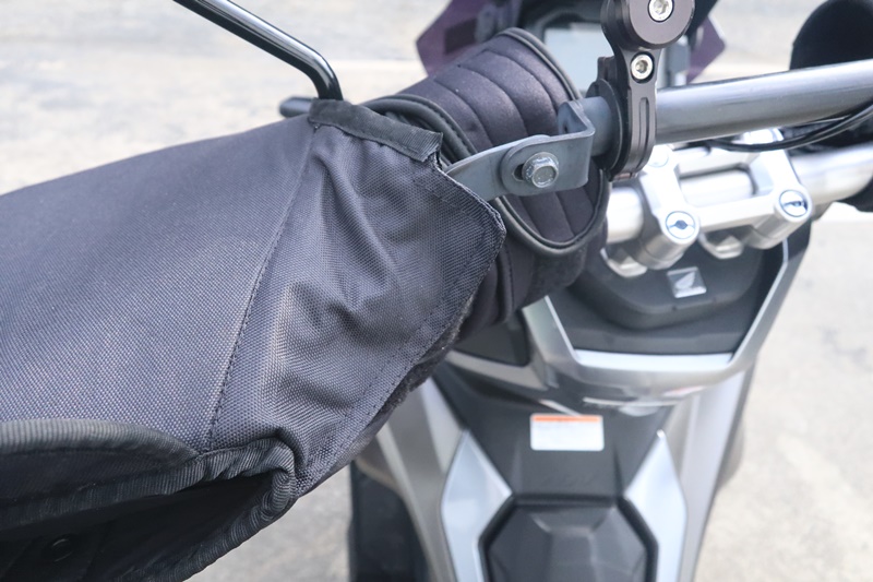 このハンドウォーマーの特徴としてナックルガードに被せて取り付けることができます。