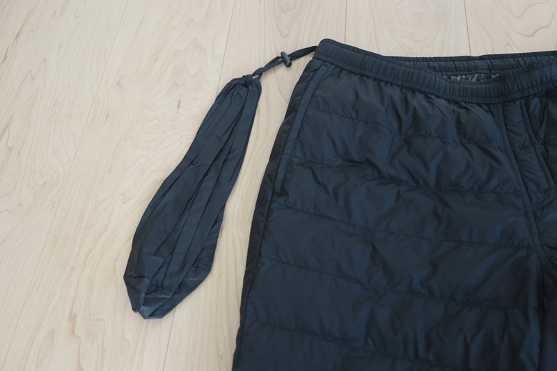 次ですが、付属の収納袋がついているのでアウトドアのダウンパンツらしく、小さく収納することもできます。